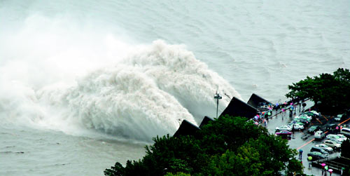石門水庫前天凌晨起開始排洪,昨天開啟兩座排洪道,以每秒400立方米水量排洪。圖片來源:臺灣《聯合報》