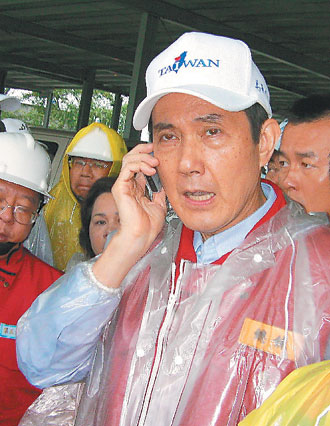 馬英九昨到嘉義縣民雄鄉勘災,拿手機打給臺北市消防局征調橡皮艇支持。圖片來源:臺灣《聯合報》