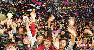 臺中市跨年晚會倒數(shù)結束后,撒下慶祝新年的紙花,民眾興奮不已。來源:臺灣《蘋果日報》