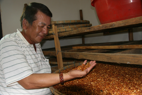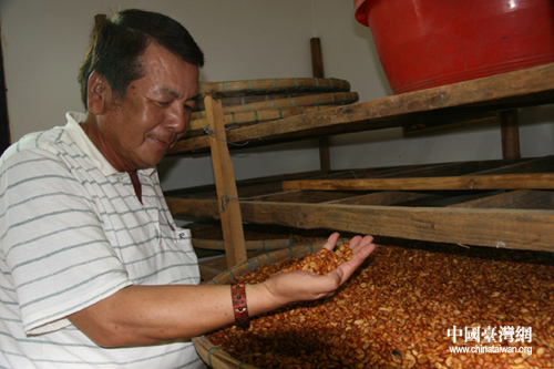 林文定向記者介紹經過曬干粗加工后的咖啡豆(攝影 邵磌)