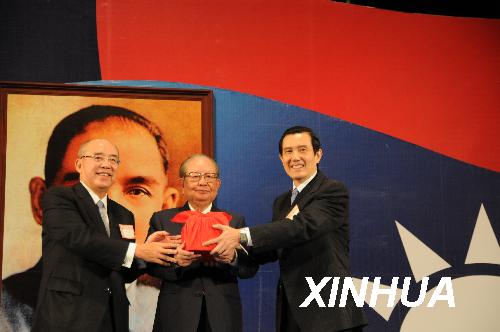 10月17日上午,馬英九在臺北舉行的中國國民黨第十八次全代會上正式接任國民黨主席。這是馬英九(右)從吳伯雄(左)手中接過國民黨主席印信,完成黨主席職務的交接。新華社記者陳斌華攝