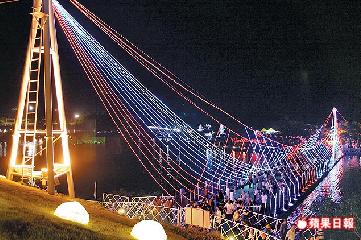 為慶祝七夕情人節,主辦單位宜蘭縣政府特地在公園搭起由浮筒建造,長65米、寬6米,橋梁纜繩以七彩LED管燈布置,可容納150對情侶同時度過的“鵲橋”。來源:臺灣《蘋果日報》