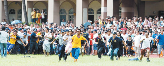 臺灣救援直升機昨天陸續載出高雄縣小林、六龜災區村民,在旗山中學守候的家屬等不及直升機降落就往前沖,警察連忙緊追攔人。圖片來源:臺灣《聯合報》