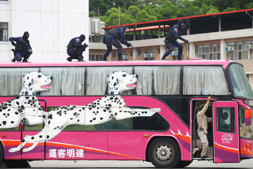 臺北花博反恐維安演訓15日舉行,維安特勤隊與臺北市警局人員模擬公車遭挾持后,進行談判、狙擊、攻堅與人質搶救。圖片來源:“中央社”