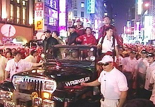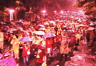 | 中國臺灣網(wǎng)9月16日消息 據(jù)臺媒報道,由臺“倒扁”總部發(fā)起的“915螢光圍城游行”在昨天傍晚6時正式出發(fā)。雖然臺島北部受到臺風(fēng)影響,時雨時晴,但游行人群熱情不減,據(jù)稱有逾75萬之眾身著紅衣、手拿紅色熒光棒,在總指揮施明德的帶領(lǐng)下,對臺當(dāng)局“總統(tǒng)府”和陳水扁的玉山寓所形成包圍之勢,“嗆扁”下臺,“阿扁下臺”的喊聲響徹臺北街頭。(云鵬)
