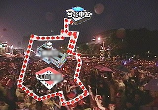 臺灣民眾高舉游行路線模型,三個圖標(biāo)從下往上依次是陳水扁玉山寓所、臺當(dāng)局“總統(tǒng)府”和臺北火車站(以上圖片來源:臺灣東森新聞報) |