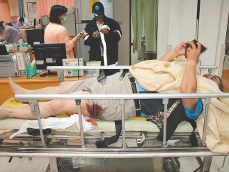新竹縣議員候選人羅吉坤,昨晚遭歹徒開槍射擊,子彈貫穿左大腿,流血不止;他躺在病床上忍著痛電告支持者,會堅持下去。 圖片來源:臺灣《聯合報》