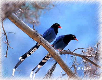型態特征:全長約六十五公分,尾羽即占全長的三分之二。碧藍身軀,朱紅嘴喙,尾巴末端為白色。
