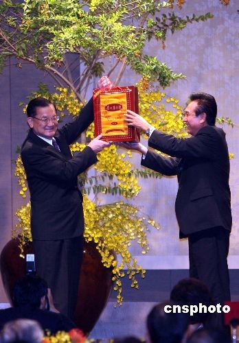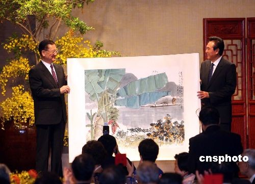 連戰(zhàn)依照習俗向陳云林[右]送上名產(chǎn)作為手禮,并送贈一幅表現(xiàn)臺灣鄉(xiāng)村風貌的書畫。