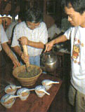 北埔在新竹各客家莊中,不僅以傳統(tǒng)聚落、古跡保存完好馳名,在特產(chǎn)小吃方面,也因長期人文薈萃,及近年觀光產(chǎn)業(yè)興盛,而發(fā)展出精致多元的鄉(xiāng)土風(fēng)味。 北埔觀光興盛,特產(chǎn)小吃也頗為發(fā)達(dá),一般常見的客家風(fēng)味,如粄條、福菜、客家粿、姜絲炒大腸等,在北埔的餐館食鋪都可以吃得到;此外,農(nóng)歷9月還有獨(dú)特的柿子大餐。而群山環(huán)抱的北埔,丘陵多,雨量豐沛,造就茶樹極佳的生長環(huán)境,所產(chǎn)茶葉質(zhì)醇味甘,享譽(yù)國際。除了一般品茗,北埔的餐廳、茶坊,以傳統(tǒng)客家“吃茶”文化,發(fā)展出頗具特色的擂茶,濃郁的茶香、米香召喚著往來的游客。 擂茶 “擂茶”為海陸客家人特有的飲食習(xí)慣,由于其主要原料——米仔、茶葉,以及擂缽、擂棍等道具,輕巧易攜帶,客家先民由大陸渡海來臺時(shí),便將此項(xiàng)傳統(tǒng)一起帶到臺灣來了。 擂茶的作法,是將綠茶、花生及芝麻等基本配料,依次放入擂缽里,以擂棍研磨,并不時(shí)加入少許冷水,續(xù)放入紫蘇、香菜、食監(jiān)等材料,約15分鐘左右,擂缽里的茶漿變成墨綠色后,就可沖入開水一起食用,濃烈的米香、花香味,和著淡淡的茶香,吃起來別具風(fēng)味。擂茶除搭配糕餅、米粿等茶點(diǎn)食用外,還可在研擂過程中加入米仔、四季豆、雪里紅、豆干等配料,成為營養(yǎng)可口的正餐。北埔的擂茶店,以廣福茶坊、北埔擂茶及番婆坑客棧最具代表。 芋頭餅·蕃薯餅 清末民初,臺灣物質(zhì)缺乏,客家先民以芋頭及蕃薯為餡,制成中秋月餅,從此成了客家糕餅的代表。來到北埔的游客總要帶上幾盒,隆源、瑞源、新合春都是近百年歷史的老店,強(qiáng)調(diào)純手工作法,制作出來的芋頭餅及蕃薯餅,油而不膩,皮酥而不焦,內(nèi)餡綿細(xì),入口即化,其中瑞源所賣的芋頭餅及蕃薯餅,因甜度較低,較符合年輕人的口味。 柿餅·柿子大餐 九九飲食店 地址 南興街152號 電話 (03)580-3226,580-2305 營業(yè)時(shí)間 1100~2030 店內(nèi)特色 柿香糯飯、柿醋溜魚、柿子雞湯 北埔的柿餅名氣雖不及新埔,但當(dāng)?shù)夭蛷d業(yè)者巧思融合客家菜肴的美味與柿餅的清香,開發(fā)出一道道風(fēng)味獨(dú)特的柿子大餐,蔚為當(dāng)?shù)靥厣鹘y(tǒng)客家菜味道咸重,而風(fēng)干過的柿餅則具有獨(dú)特的甜香,結(jié)合兩者的柿子大餐清香爽口而不油膩。北埔推出柿子大餐的餐廳以九九飲食店最道地,每年10~12月柿子飄香時(shí)節(jié)供應(yīng)。 廣福茶坊 地址 北埔村10號 電話 (03)580-4543 營業(yè)時(shí)間 1000~翌日0200 店內(nèi)特色 擂茶 與天水堂二房對街相望的廣福茶坊,賣的茶相當(dāng)多樣化,由客家傳統(tǒng)擂茶、北埔特產(chǎn)膨風(fēng)茶,到梨山、阿里山等地的高山茶,應(yīng)有盡有。這里的擂茶由北埔農(nóng)會專人指導(dǎo),特別講究配料。茶坊里滿溢清新茶香,而挑高的空間設(shè)計(jì),正可俯看天水堂二房疊疊層層的院落,別有一番韻味。 北埔食堂 地址 北埔街4號 電話 (03)580-1156 營業(yè)時(shí)間 0900!1400、1630~2030 休息時(shí)間 每月第二、四個(gè)周二 店內(nèi)特色 姜絲炒大腸 位于慈天宮廟埕前方的北埔食堂,賣的是道地客家傳統(tǒng)菜肴,古樸的木制桌椅,舊時(shí)農(nóng)家所用的木質(zhì)飯筒及菜櫥,加上墻上一幅幅老電影海報(bào),讓店里充滿濃濃懷古氣息。 老街粄條 地址 廟前街31號 電話 (03)580-3871 營業(yè)時(shí)間 平日0900~1730 假日0900~1930 店內(nèi)特色 粄條、蒜絲大腸 老街粄條在懷舊中帶了點(diǎn)粗獷味道,厚實(shí)的木制桌椅、墻角的土角墻面、老縫紉機(jī)、舊式火鍋……,都是主人特意設(shè)計(jì),主人賣了十幾年的客家粄條,早有口碑,這里的粄條軟Q滑溜,口味道地,煮法上則干、湯、炒各有所長。此外,姜絲大腸也是店里的招牌菜。 |