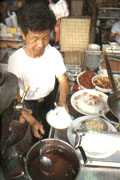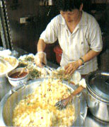 提到新竹小吃,馬上令人聯(lián)想到城隍廟。新竹城隍廟小吃在日據(jù)時(shí)代就已經(jīng)成形,當(dāng)時(shí)有“庶民味覺(jué)的殿堂”之稱,時(shí)至今日,這里仍然是新竹小吃的大本營(yíng),范圍涵蓋了城隍廟和法蓮寺前方的廣場(chǎng),與廣場(chǎng)外圍的東門(mén)街、中山路一帶,約50家攤子搭棚架瓦,把古跡級(jí)的城隍廟團(tuán)團(tuán)圍住,形成一個(gè)熱鬧的商區(qū),其中不乏三代相傳的知名老攤。 除了米粉、貢丸、肉圓三大新竹傳統(tǒng)小吃齊聚于此,魯肉飯、潤(rùn)餅、魷魚(yú)羹、蚵仔煎等亦別具滋味,工作賣(mài)力的攤主們從早餐賣(mài)到宵夜,24小時(shí)來(lái)這里都可以尋得美味,是新竹人吃三餐飽肚、游客品嘗新竹美味的必到之地。 廟口林家肉圓 電話:(03)522-9008 營(yíng)業(yè)時(shí)間:9點(diǎn)-24點(diǎn) 休息時(shí)間:每月最后一個(gè)周二 店內(nèi)特色:香菇肉貢丸、蔥肉肉圓、栗子肉圓、四神湯 正對(duì)城隍廟戲臺(tái)的林家肉圓,為祖?zhèn)魅睦系辏约t糟肉、蔥為餡料,裹上蕃薯粉、糯米合制的外皮,口味特殊,為新竹肉圓的正宗吃法。此外,用香菇、絞肉加蠔油、香料炒香后,再包進(jìn)肉漿制成的香菇肉貢丸,也是林家獨(dú)步的美食。而用小腸和薏米以文火煨透的四神湯,吃起來(lái)滑嫩不膩,灑上龍鳳酒,味道更加香醇,是搭配肉圓的上選湯品。 林家甜品 電話:(03)523-0343 營(yíng)業(yè)時(shí)間:09點(diǎn)半-21點(diǎn)半 休息時(shí)間:每月最后一個(gè)周二 店內(nèi)特色:綜合冰、紅豆牛奶冰  這是城隍廟唯一賣(mài)冰品甜點(diǎn)的攤子,紅豆綠豆、蓮子桂圓、花生麥角等古味十足的傳統(tǒng)配料,是讓小攤屹立60多年的重要功臣。不同于一般煮得糊爛的冰點(diǎn)配料,林家阿伯把綠豆、麥角煮得恰好熟透、顆粒分明,吃起來(lái)口感香綿。因?yàn)榭驮捶(wěn)定,冷熱甜品都有,所以即便冬天前來(lái),也不怕吃不到林家阿伯的“甜頭”。 王記蚵仔煎 電話:(03)521-5625 營(yíng)業(yè)時(shí)間:09點(diǎn)半-21點(diǎn) 休息時(shí)間:每月最后一個(gè)周二 店內(nèi)特色:蚵仔煎、肉燕湯、魚(yú)粳湯 采用每天清晨自嘉義東石運(yùn)來(lái)的蚵仔,是王記蚵鮮味美的秘訣,而蚵仔煎要好吃,最重要的就是地瓜粉勾芡的功夫,粉水比例恰當(dāng),煎起來(lái)才會(huì)軟中帶Q,表皮香脆;另外,王記的肉燕也很特別,尤其是燕皮的制作費(fèi)工,別處很難吃到;而湯鮮味美的魚(yú)粳湯,亦是吃蚵仔煎的絕妙搭配。  元祖潤(rùn)餅 電話:(03)522-2285 營(yíng)業(yè)時(shí)間:10點(diǎn)-21點(diǎn)半 休息時(shí)間:每月最后一個(gè)周二 店內(nèi)特色:潤(rùn)餅 創(chuàng)店80多年、傳承五代的郭家潤(rùn)餅,是新竹地區(qū)的潤(rùn)餅老店,因知名度頗高,故攤前常見(jiàn)大排長(zhǎng)龍的盛況。其與眾不同之處,在于用梨山高麗菜、紅蘿卜、白蘿卜炒香后,鹵制成口味獨(dú)特的鹵菜,加上蛋酥、菜脯、沙豆干、香菜、花生粉、豆芽等多種配料,再用香Q帶勁的自制餅皮包起來(lái)卷上,既快速又好吃,無(wú)怪乎甚受大眾喜愛(ài)。