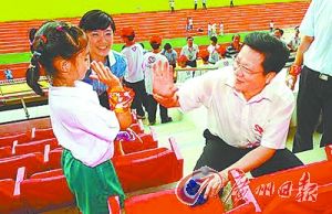 廣東省委常委、廣州市委書記張廣寧(右)在天河體育中心清潔亞運(yùn)場(chǎng)館,與小志愿者擊掌互相鼓勵(lì)。 吳楚斌 攝《人民日?qǐng)?bào)》記者 羅艾樺 賀林平