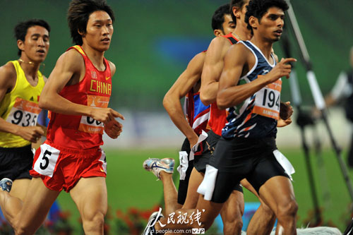 人民網廣州11月24日電(記者 關騰飛攝影報道)廣州亞運會田徑男子800米第一輪第一組,中國選手張海坤以1分50秒01的成績,位列小組第四,無緣決賽。伊朗選手薩賈德·穆拉迪和