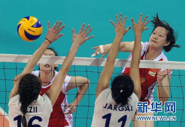11月21日,中國隊球員陳麗怡(右)在比賽中扣球。當日,在第16屆亞運會女子排球預賽中,中國隊以3比0戰勝蒙古國隊。新華社發(李秋嬋攝)