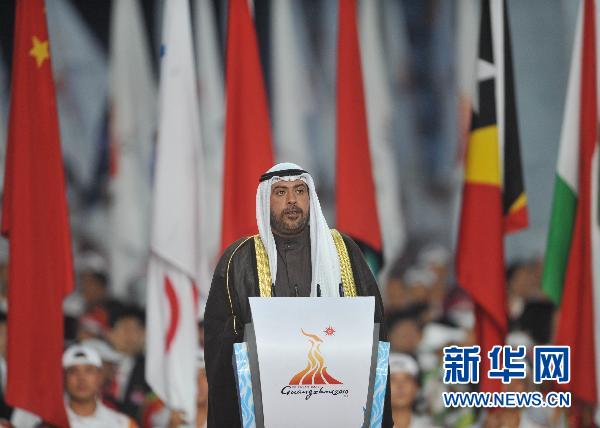 11月27日,亞奧理事會主席艾哈邁德·法赫德·薩巴赫親王(中)致辭。當日,第16屆亞運會閉幕式在廣州市海心沙島舉行。 新華社記者楊磊攝