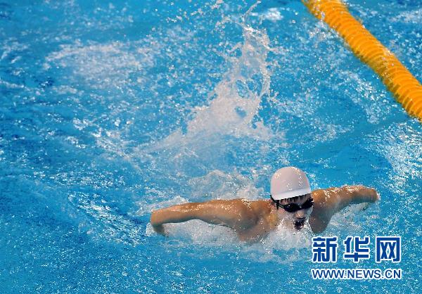 12月13日,中國(guó)選手樓陳泉在比賽中。當(dāng)日上午,在廣州2010亞殘運(yùn)會(huì)游泳比賽男子S11級(jí)100米蝶泳決賽中,中國(guó)選手樓陳泉以1分07秒04的成績(jī)奪得冠軍。新華社記者王頌攝