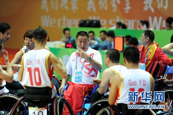 12月14日,中國男子輪椅籃球隊主教練翟永君(中)在對陣阿聯酋隊的比賽中為球員布置戰(zhàn)術。 52歲的翟永君是我國第一批輪椅籃球運動員,曾經的主力國手。中國輪椅籃球的發(fā)展,只有短短23年的時間,為了提高此項競技項目的水平,翟永君奉獻了寶貴的23年。新華社記者劉大偉攝