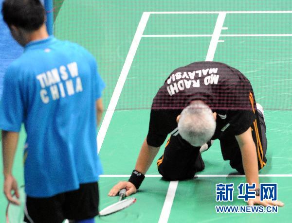 12月14日,在廣州2010亞殘運會羽毛球賽場上,中國選手田時偉對決馬來西亞選手朱哈里的男子單打站立一級半決賽,就像林丹大戰李宗偉,以精彩絕倫的交鋒展開一場“瑜亮之爭”,又以催人淚下的悲情畫上句號。當中國羽毛球選手田時偉丟下拍子、慶祝闖入決賽的喜悅時,他的對手馬來西亞球員拉迪 朱哈里仰天長嘆,流下熱淚。得分時雙拳緊握,為抵抗傷痛不時揚起球拍,朱哈里用自己的方式詮釋了什么叫做“雖敗猶榮”。這是馬來西亞選手拉迪 朱哈里(右)失分后懊悔跪地。 新華社記者王松攝