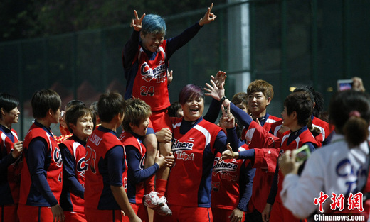 11月26日,在廣州亞運會壘球女子決賽后,獲得銅牌的中華臺北隊運動員在上場領(lǐng)獎前用搞怪的動作來慶祝。中新社記者 張茵 攝