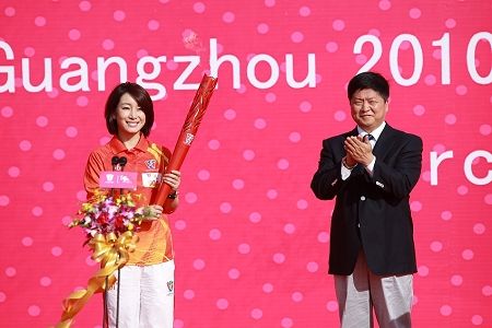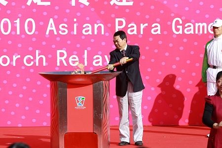 12月9日,廣州亞殘運會火炬傳遞活動進入第五天。上午9時34分,第一棒火炬手、國家話劇院國家一級演員、中國殘聯愛心大使秦海璐從廣州市委常委、廣州警備區司令員顏小明手中接過火炬,宣告傳遞活動正式開始。