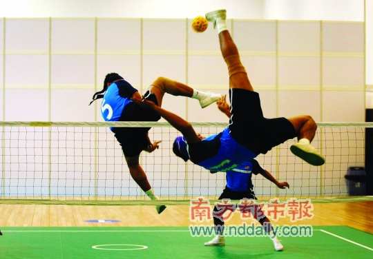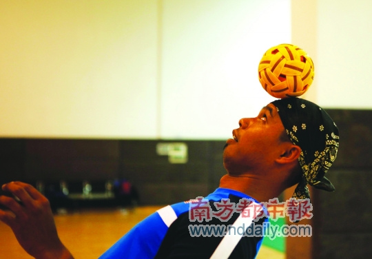 即便像AZM AN這樣的專業藤球運動員,頭部也要包裹一塊頭巾——— 可不是為了扮酷,頭巾的作用是要緩沖“硬邦邦”的塑料球。難怪藤球又叫“疼球”,連聯合會主席哈利姆先生都說要把藤球做得更柔軟才會有中國小孩子青睞,想必他們也跟我一樣害怕被這樣的硬物砸傷頭顱吧。 (記者張艷芬 竇俊 實習生張潔瑤 攝影劉可)