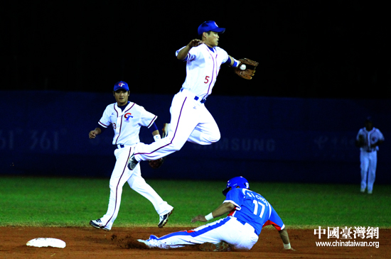 亞運棒球決賽,中華臺北隊3:9不敵韓國隊獲得亞軍。圖為韓國隊隊員上壘被中華臺北隊截殺。(中國臺灣網(wǎng) 沈鵬 攝)