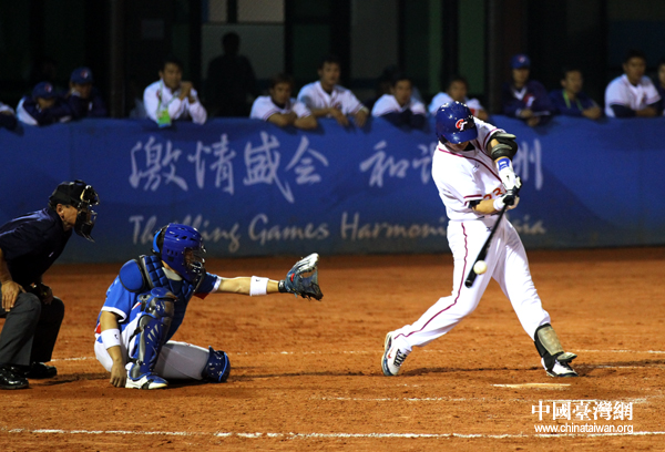 亞運棒球決賽,中華臺北隊3:9不敵韓國隊獲得亞軍。圖為中華臺北隊隊員擊球。(中國臺灣網(wǎng) 鐘寶華 攝)