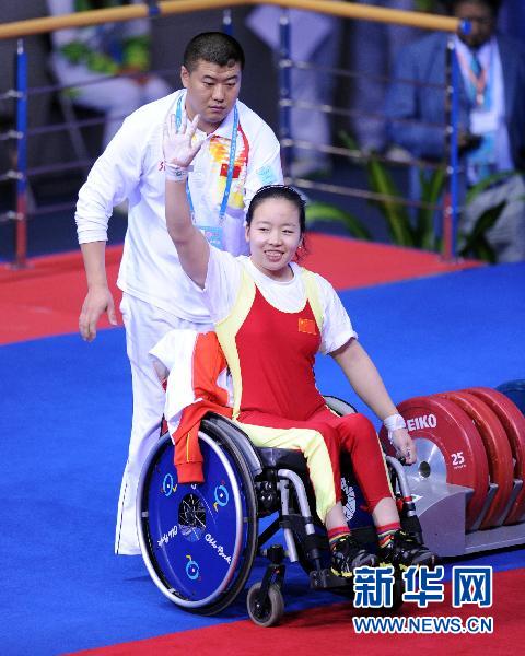 12月14日,中國選手石珊珊向觀眾致意。當日,在2010年廣州亞殘運會女子48公斤級舉重比賽中,石珊珊以110.0公斤的成績奪得金牌。新華社記者范長國攝