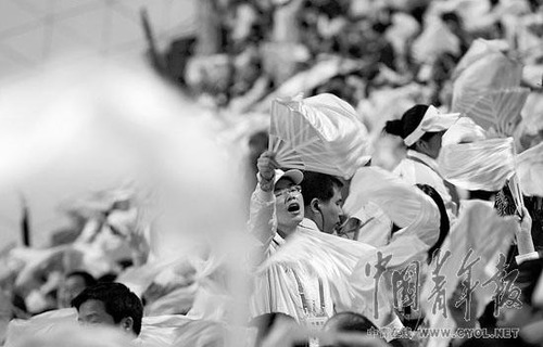 11月12日,廣州亞運會開幕式“綠色一分鐘”環節,志愿者帶領觀眾揮舞著綠色絲帶。本報記者 陳劍攝