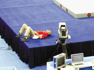 激烈的賽事,讓裁判員、計分員幾乎沒有休息的時間。真的困了累了,卻找不到紅牛怎么辦?瑞士計分大叔教你一招:待場館清場、比賽臺清潔過后,直接躺在上面,藍布為床單、天花板為被,偌大的場館打個呼嚕,也不會有人抗議。