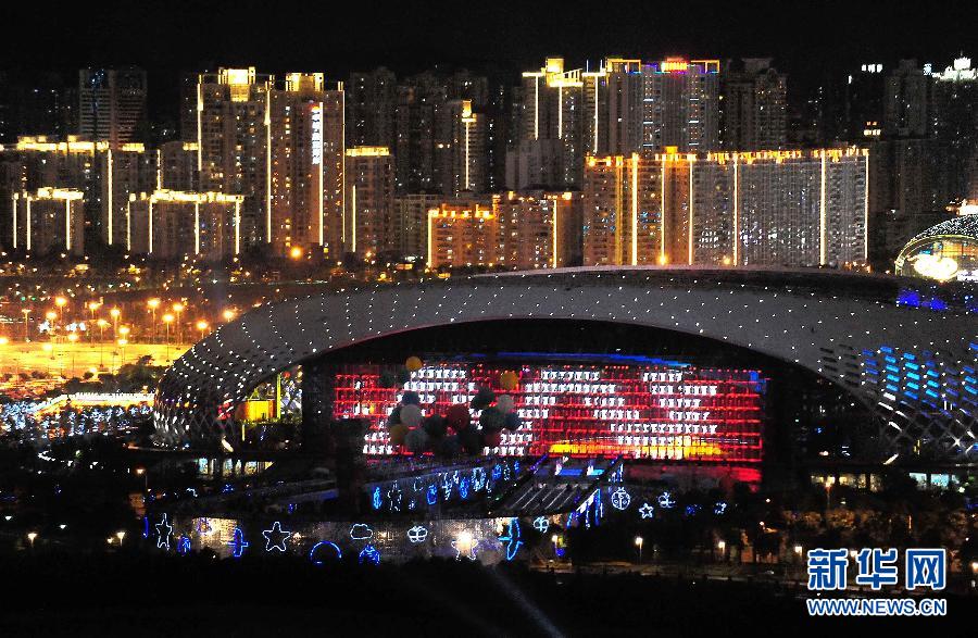 坐落在深圳灣畔的“春繭”,流光溢彩,美輪美奐(2011年8月10日攝)。為營(yíng)造優(yōu)美、亮麗的城市環(huán)境迎接大運(yùn)會(huì)的舉辦,深圳市實(shí)施了包括景觀照明提升、道路照明改造、城市照明凈化等內(nèi)容的城市照明工程。每當(dāng)夜幕降臨,深圳成了一座“彩色透明城”,處處呈現(xiàn)燈火璀璨、火樹(shù)銀花的美景。新華社記者王頌攝