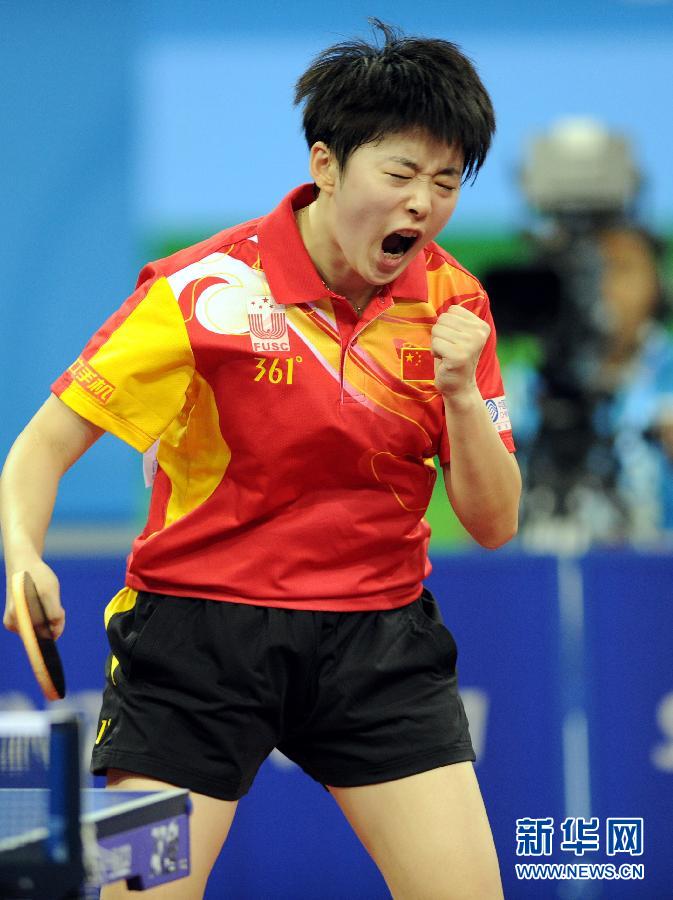 8月13日,中國(guó)隊(duì)選手饒靜文在比賽中慶祝得分,她以3比1戰(zhàn)勝中華臺(tái)北隊(duì)選手鄭怡靜。當(dāng)日,在第二十六屆世界大學(xué)生運(yùn)動(dòng)會(huì)乒乓球女子團(tuán)體首輪比賽中,中國(guó)隊(duì)以3比0戰(zhàn)勝中華臺(tái)北隊(duì)。新華社記者楊世堯攝