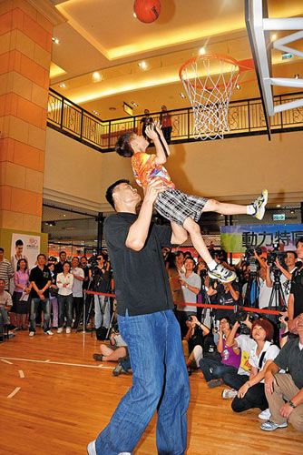 圖為姚明26日晚上到義大世界與小球迷親密接觸,當場將小朋友抱起來灌籃。圖片來源:臺灣中國時報