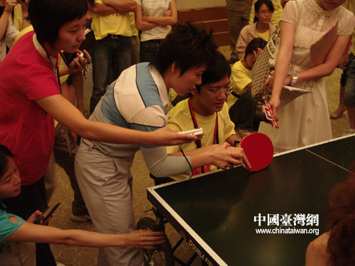 來自臺(tái)灣政治大學(xué)的湯紹成教授有備而來,自己準(zhǔn)備了球拍,在輸給鄧亞萍后仍然很開心,向記者表示:“今天能和世界冠軍打上一個(gè)回合我就已經(jīng)很開心了。”