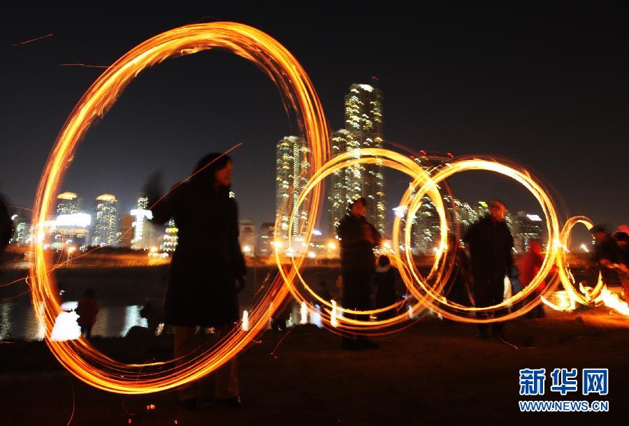 2月5日,在韓國首爾,人們燃放煙花迎元宵。當日,為迎接即將到來的傳統節日——元宵節,首爾居民舉行了多種慶祝活動。在韓國,元宵節有很多風俗,如吃年糕、五谷飯、花生、核桃等干果,喝耳明酒,“焚燒月亮屋”許愿,放風箏、玩尤茨游戲等。新華社發(樸真熙攝)