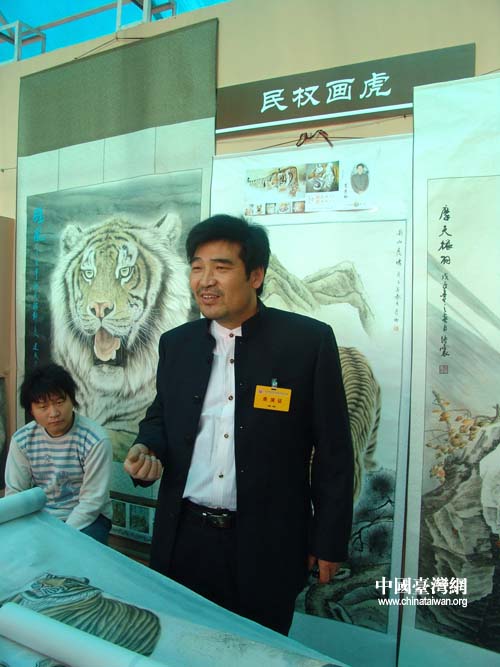 自幼酷愛畫虎的王建金如今已成為中央書畫研究院研究員,在國外辦過個人展,他的國畫工筆也成為此次展演中的一大熱點。(李杰 攝)