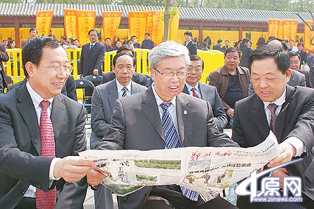 預演現場,中華炎黃文化研究會常務副會長張文彬,省政協主席王全書,省委常委、市委書記王文超閱讀《大河報》刊發的拜祖大典消息。記者 汪靜文 攝