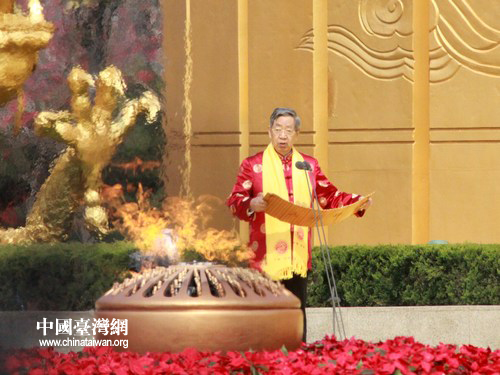 十屆全國(guó)人大常委會(huì)副委員長(zhǎng)、中華炎黃文化研究會(huì)會(huì)長(zhǎng)許嘉璐恭讀《拜祖文》。(中國(guó)臺(tái)灣網(wǎng) 馬迪 攝)