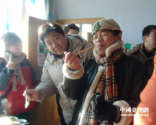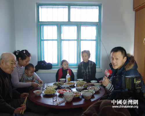 記者們到達(dá)時(shí),王慶榮一家人正在吃午飯。臺(tái)灣年代電視臺(tái)的記者陳立國(guó)經(jīng)不住火炕的溫暖,地道的東北農(nóng)家菜的吸引,爬上火炕與大家坐到一起。