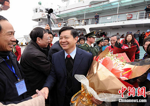 2月16日,農(nóng)歷正月十四下午,出席第九屆“兩馬同春鬧元宵”系列活動的馬祖縣長楊綏生、馬祖知名人士曹爾忠一行,乘坐“臺馬輪”經(jīng)“兩馬”航線抵達(dá)福州港馬尾客運(yùn)站,受到當(dāng)?shù)責(zé)崃覛g迎。中新社記者 劉可耕 攝