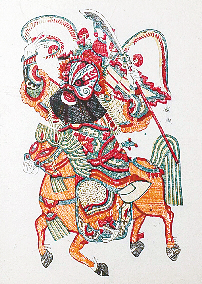 鳳翔年畫是西北地區的代表性年畫,源于宋盛于清,是千百年來西北地區民俗民情的藝術反映。在雕刻藝術上,鳳翔年畫繼承了秦漢唐宋石刻和壁畫藝術端莊樸實、凝重大方的特點,揉進了本地刺繡剪紙的造型技巧,并借鑒了秦腔的表演藝術風格,強調夸張和變形,畫面粗獷豪放而又鮮活靈動。鳳翔年畫工藝流程復雜,從畫墨線稿到印刷要經過十三四道工序。由于地處西北受外部影響少,它保持了古版年畫的純粹民間風格,無論是人物還是花卉,造型都生動逼真。例如騎馬的秦瓊門神畫就吸收了秦腔臉譜的變形藝術,人物雙眉直豎、雙眼噴火,下巴夸張變寬,具有殺氣騰騰、鎮妖除邪的威風感。