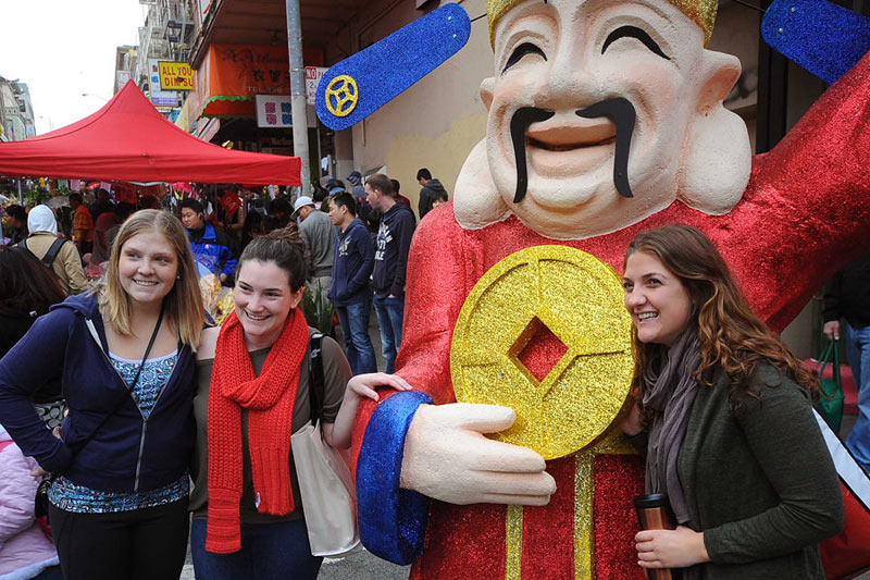 當地時間1月30日,在美國舊金山唐人街舉行的年宵花市上,幾個美國姑娘和中國財神合影。為期兩天的舊金山年宵花市于當天結束。當地民眾和游客在花市上不僅可以選購年貨,還可以觀賞文藝表演。年宵花市拉開了舊金山農歷新年一系列慶祝活動的序幕。
