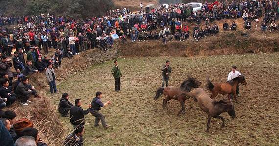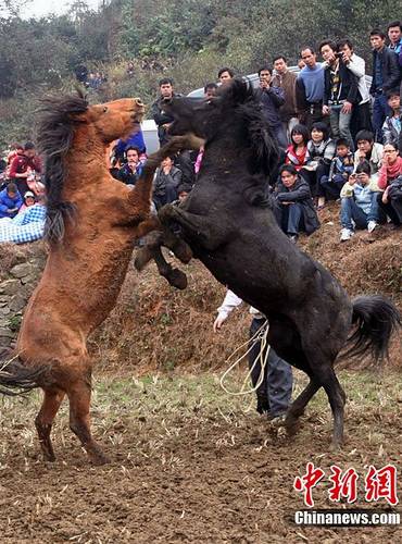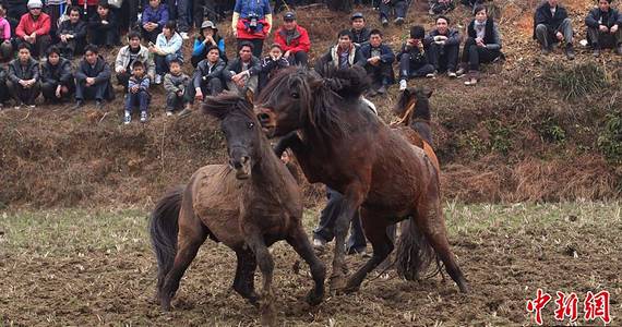 2月8日,廣西融水縣安太鄉(xiāng)培地苗寨舉行斗馬比賽。近20匹駿馬激烈的咬、踢、追等扣人心弦的格斗,吸引眾多游客到場(chǎng)觀看。“斗馬”已有500多年歷史,是當(dāng)?shù)孛缱逋麨椴脹Q婚姻而設(shè),現(xiàn)演變?yōu)橐豁?xiàng)娛樂活動(dòng)。龍林智 攝 圖片來(lái)源:CNSPHOTO