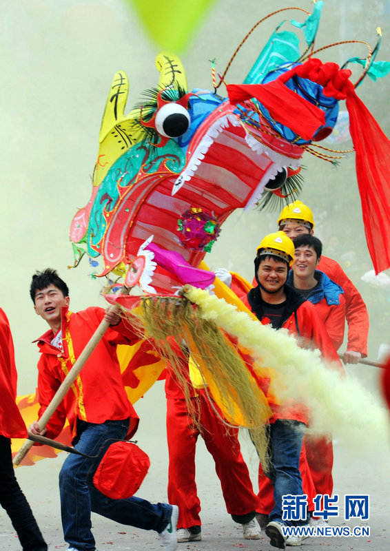 2月16日,德江縣街頭,一支舞龍隊(duì)伍在表演。當(dāng)日,貴州省德江縣的10萬土家族群眾走上街頭舞龍燈、演儺戲、扭秧歌,喜迎元宵節(jié)。 新華社記者 劉續(xù) 攝