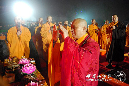 佛教在線四川訊 2011年2月16日(農(nóng)歷正月十四)晚,由峨眉山佛教協(xié)會(huì)主辦的“萬(wàn)盞明燈供普賢”大型祈福供燈法會(huì)在峨眉山大佛禪院前山門廣場(chǎng)隆重舉行,當(dāng)天法師、居士、游人、市民近萬(wàn)人參加了法會(huì)。法會(huì)禮請(qǐng)中國(guó)佛教協(xié)會(huì)副會(huì)長(zhǎng)、四川省佛教協(xié)會(huì)會(huì)長(zhǎng)、峨眉山佛教協(xié)會(huì)會(huì)長(zhǎng)永壽法師主法。