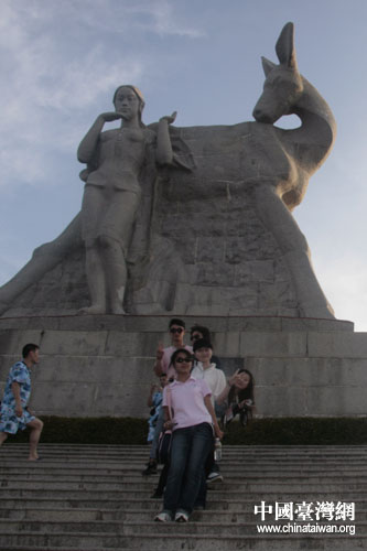 來自臺灣的營員在中國大陸版圖的石雕前留影