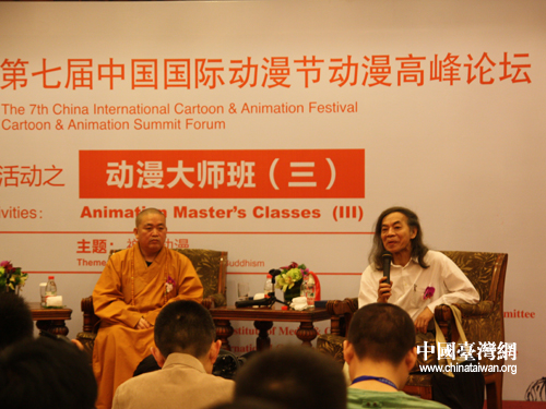 4月29日,臺(tái)灣著名漫畫(huà)家蔡志忠出席第七屆中國(guó)國(guó)際動(dòng)漫節(jié),與少林寺方丈釋永信一起“禪說(shuō)動(dòng)漫”。(中國(guó)臺(tái)灣網(wǎng) 李丹 攝)