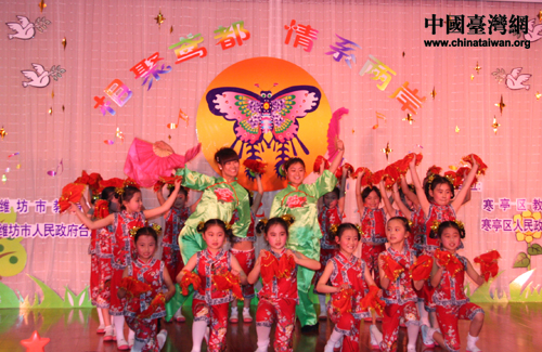 中國臺(tái)灣網(wǎng)4月21日濰坊消息 昨晚,臺(tái)灣新竹磐石中學(xué)的師生們和濰坊市寒亭區(qū)實(shí)驗(yàn)小學(xué)、外國語學(xué)校的師生們共同舉辦了兩岸青少年專場(chǎng)文藝晚會(huì)。晚會(huì)形式多樣,節(jié)目精彩紛呈。當(dāng)晚的節(jié)目有現(xiàn)代舞、古箏演奏、街舞、合唱、趣味游戲、吉他彈唱等,兩岸青少年都拿出了看家本領(lǐng),通過藝術(shù)交流的形式,期盼增進(jìn)彼此的友誼。濰臺(tái)同歌舞、兩地一家親。