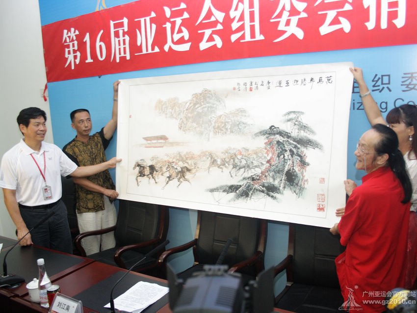 劉江南在致辭中說(shuō),廣州亞組委曾向全亞洲人民做出承諾,不僅要將本屆亞運(yùn)會(huì)辦成精彩紛呈的體育盛會(huì),也要辦成傳承奧林匹克精神、融合亞洲各地區(qū)文化,同時(shí)彰顯中國(guó)傳統(tǒng)文化的一次文化盛會(huì)。國(guó)畫(huà)家張松濤將親筆之作《萬(wàn)馬奔騰迎亞運(yùn)》捐獻(xiàn)給廣州亞組委,不僅表達(dá)了他對(duì)廣州亞運(yùn)的一片深情,更將中國(guó)傳統(tǒng)文化帶到國(guó)際舞臺(tái),為彰顯中國(guó)文化和嶺南文化做出了貢獻(xiàn)。