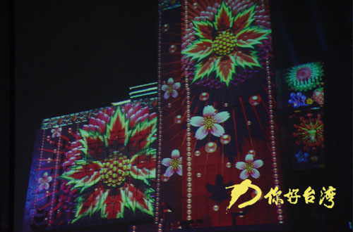 以上三幅圖片為本網(wǎng)記者在記者會(huì)現(xiàn)場,從屏幕上拍下的畫面——燈光投影下的臺(tái)北市政府大樓墻面(你好臺(tái)灣網(wǎng) 葉進(jìn)華 王小珍 攝)
